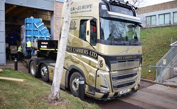 The equipment packed into 15 custom made boxes. The packaging alone weighing 4 tonnes. Three articulated lorries were loaded by forklift and crane and transported to Southampton.